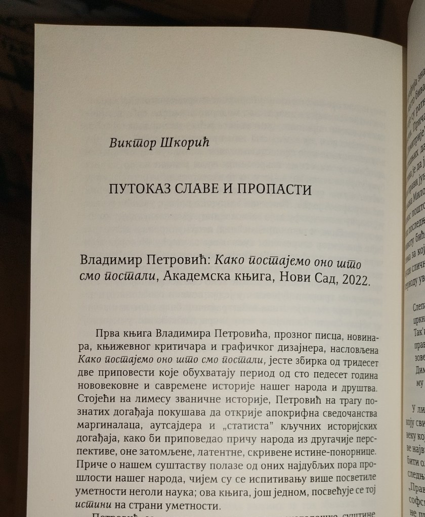 Vladimir Petrović svojom knjigom Kako postajemo ono što smo postali daje još jedan glas u našoj književnosti koji zahteva od nas da ponovo sagledamo istoriju o kojoj smo podučavani, da promislimo o socijalnim i moralnim načelima neki događaja i da preispitamo sebe u usporedbi sa našim uzorima, prethodnicima i precima. Tamo gde dokumenti zamuknu svedočanstva bivaju ućutkana, a glasovi prošlosti utihnu, njegova knjiga izranja kao krajputaš, kao putokaz naše slave i propasti, naših pobeda i poraza, uzleta i degradacije. Iako svaka priča funkcioniše zasebno, tek u njihovoj totalnosti i dijahronom sagledavanju otkriva nam se priča o modernoj Srbiji i trenutku sadašnjem, koje nam se takođe sinhronijski razotkriva. Nema sumnje, to još valja naglasiti, da ovom knjigom Vladimir Petrović stavlja svoje ime u prvi red među pripovedačima mlađih generacija.