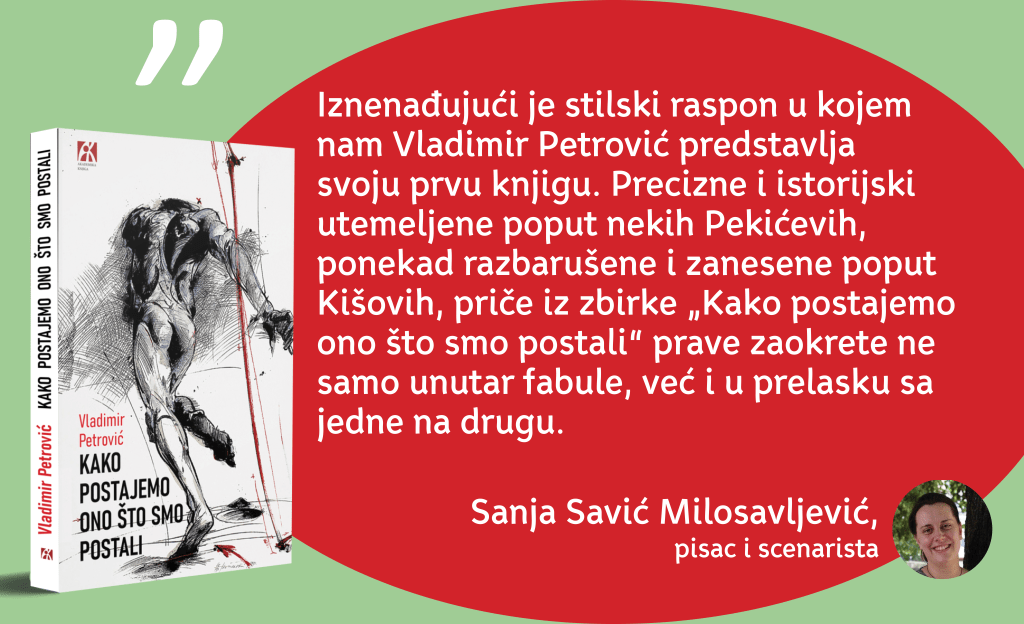 Iznenađujući je stilski raspon u kojem nam Vladimir Petrović predstavlja svoju prvu knjigu. Precizne i istorijski utemeljene poput nekih Pekićevih, ponekad razbarušene i zanesene poput Kišovih, priče iz zbirke „Kako postajemo ono što smo postali“ prave zaokrete ne samo unutar fabule, već i u prelasku sa jedne na drugu.